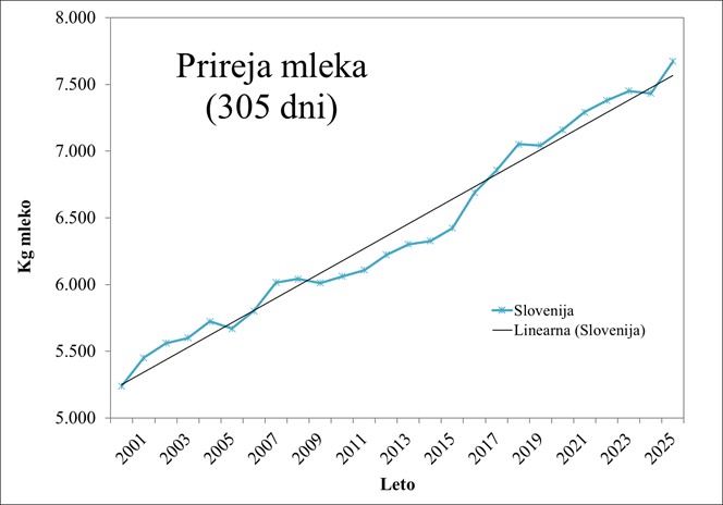 V čredah z molznicami izvajamo različne ravni kontrole. Najpogostejša je kontrola prireje mleka. Konec leta 2025 je bilo vključenih 71.536 molznic (81 % vseh molznic) v 2.502 čredi. V primerjavi z letom 2024 se je število čred zmanjšalo za 99 (- 3,4 %), število molznic za 681 (- 0,9 %). Kmetijsko gospodarstvo je v povprečju redilo 28,6 molznice/kmetijo, kar je 0,8 molznice več kot leto poprej. Kontrola prireje mleka se je izvajala po metodi AT4, v čredah z robotsko molžo (274 kmetij) po metodi A4. V obračun, ki smo ga izračunali za obdobje od 1. 11. 2024 do 31. 10. 2025, je bilo zajetih 59.465 laktacijskih zaključkov. Povprečna prireja mleka po kravi v Sloveniji v standardni laktaciji (305 dni) v letu 2025 je bila 7.674 kg mleka s 4,06 % maščobe in 3,41 % beljakovin. Mlečnost se je v povprečju povišala za 240 kg mleka. Povečali sta se tudi vsebnost maščob (+0,02 %) in beljakovin (+ 0,03 %).