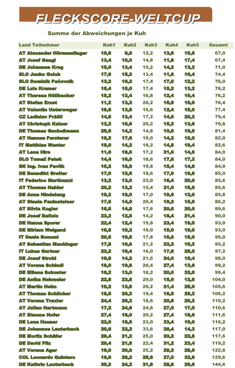 Na tekmovanju se je ocenjevalo 5 krav. Najprej so krave ocenili profesionalni ocenjevalci avstrijske rejske organizacije, katerih skupne ocene so se primerjale z ocenami tekmovalcev za končno razvrstitev. Zaradi velikega števila tekmovalcev so ocenjevali po vrstnem redu, kjer je bilo točno določeno kdaj posamezni ocenjevalec ocenjuje izbrano žival. Posamezno kravo so hkrati ocenjevali trije tekmovalci, ki so imeli 8 minut časa, da so žival ocenili in posredovali ocene sodnikom. Ocene so vpisovali v aplikacijo Fleckscore preko mobilnega telefona ali pametne tablice.